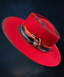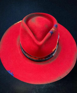 “Distressed Fedora with Red Multi-color Patchwork Design” is hand-distressed, hand-dyed, and hand-torched, ensuring no two share the same color or design. Each piece is uniquely imperfect, with subtle variations from product images.