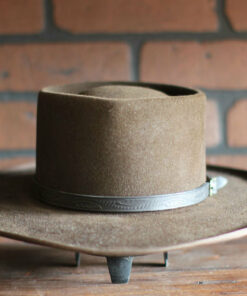 Eedrich weathered ‘Man With No Name’ Gambler hat in 100% wool felt felt and adorned with a tooled, genuine leather hatband and vintage grosgrain ribbon binding.