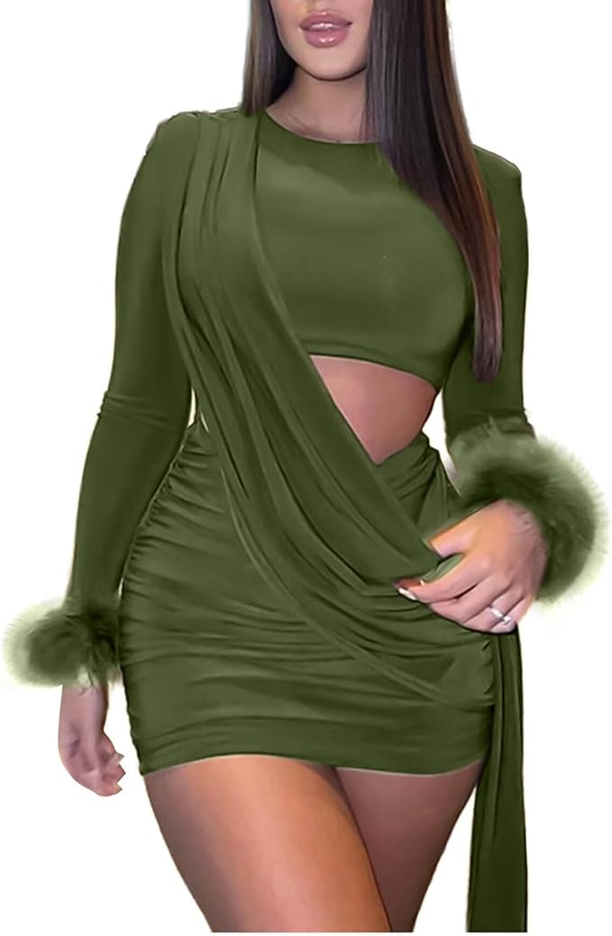 - Chic & Sexy Design: cut out, ruched dress, long sleeve tight dress, sexy club dresses for women, fall mini dress; unique soft-touch fuzzy trim on long sleeves adds luxurious texture and winter-ready glamour.