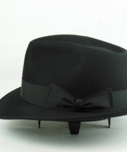 5 1/4″ open crown with teardrop crease. 1 1/2″ black ribbon with double pleated double bow. 2 1/2″ snap brim with over welted edge and double stitch detail.