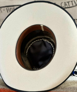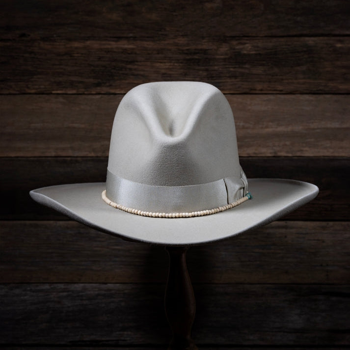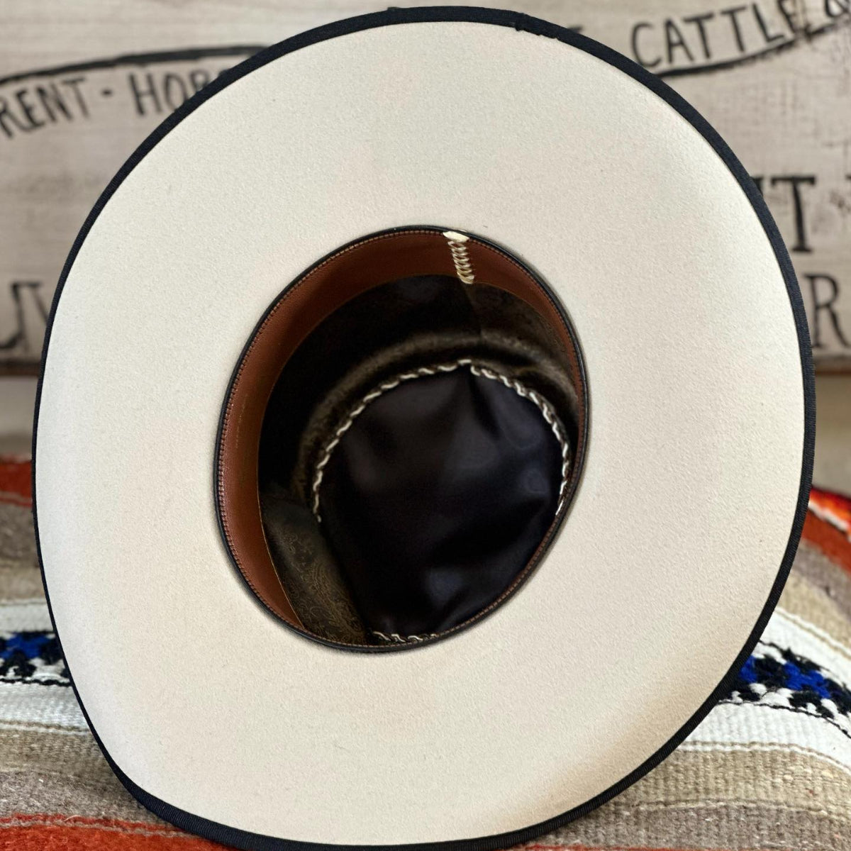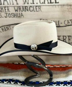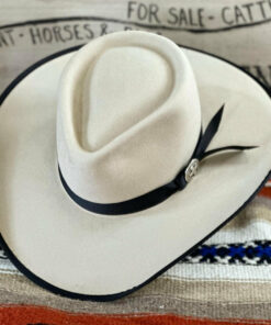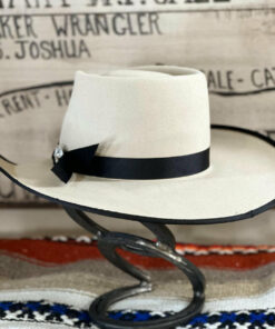 This light belly and it”s tan tones fit the bill with the black trim. The pinched front crown is 4.5″ in the back with a slight slope to 4″ in the front. The 4″ brim has a soft roll on the sides with a black bound edge. The 7/8″ grosgrain ribbon has an old fashioned look with a Cross concho to anchor it. Overall this hat is very unique with it’s look, band and style.